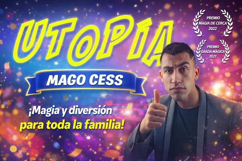 ¡Descubre un show que hará soñar a toda la familia! El joven ilusionista Cess te invita a un mundo donde lo imposible se hace realidad: Teletransportaciones, sorprendentes transformaciones y adivinaciones que desafían la lógica. Ríe, asómbrate y vuelve a sentir la ilusión de la infancia, aunque sea solo por una noche. Un plan perfecto para toda la familia. No te quedes sin tu entrada y vive la magia de “UTOPÍA”!